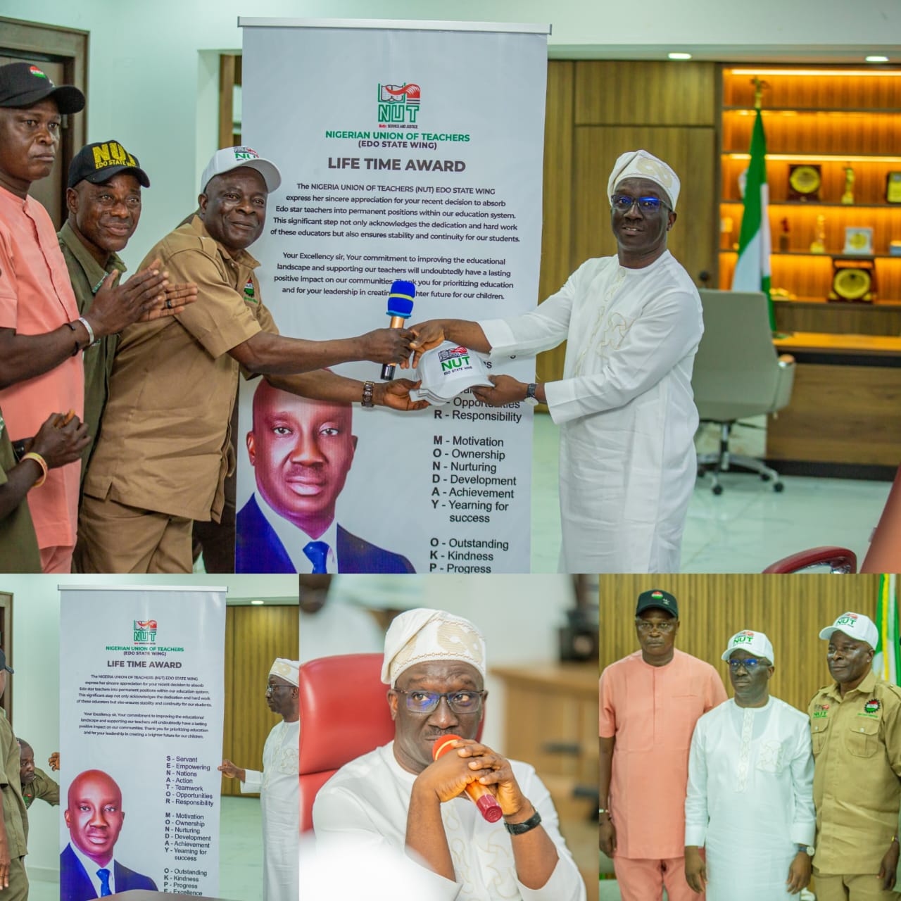 Edo State Governor, Senator Monday Okpebholo, has been conferred with a Lifetime Achievement Award by the Nigerian Union of Teachers (NUT), Edo State Wing, in recognition of his exceptional reforms and commitment to repositioning the State’s education sector.