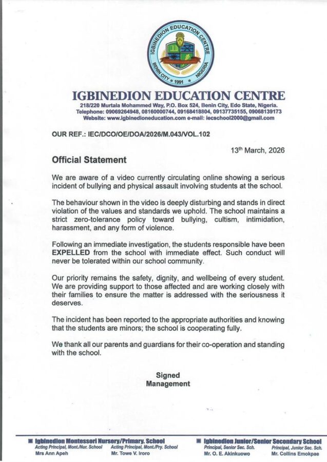 Igbinedion Secondary School Expels Students After Viral Bullying Video Sparks Outrage